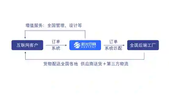 而绝大多数工厂的 IT 水平也远远不行,需要阳光印网上门搭建系统并教会他们使用。但好处是,只要教会了,磨合好了,就可以成为稳定的供应商。对工厂来说,最大的痛点永远是销售,以往他们需要雇佣外挂的销售,甚至老板自己出去跑业务,结果往往不尽如人意,远不如坐等订单上门舒服。阳光印网在平台交易中间还有一层供应链金融产品,为拿到订单的后端工厂提供低息贷款,确保不会影响工厂的按时生产。