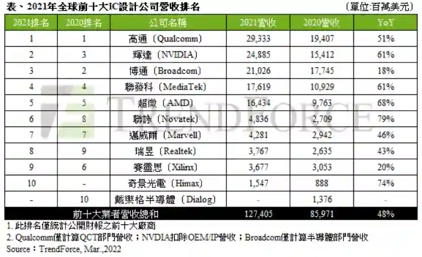【机构:全球前十大IC设计厂商营收达1274亿美元】市调机构集邦咨询发布报告,2021年全球前十大IC设计厂商营收达1274亿美元(约8128.12亿元人民币),年增48%。高通以293亿美元的营收位居榜首,年增51%。台系厂商占据了四席,分别是联发科、联咏、瑞昱和奇景光电。