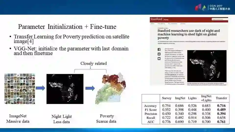 这样的一个理念在应用当中也非常有用,这是斯坦福大学最近做的一项工作,是从一个图像到卫星图像区分在非洲大陆上的贫困情况,最后就发现这种传递式的迁移方法效果确实和人为地去采样、标注效果差不多,一个是0.776,一个是0.761,而它中间人为的参与大大减少,因为它用了传递的过程。