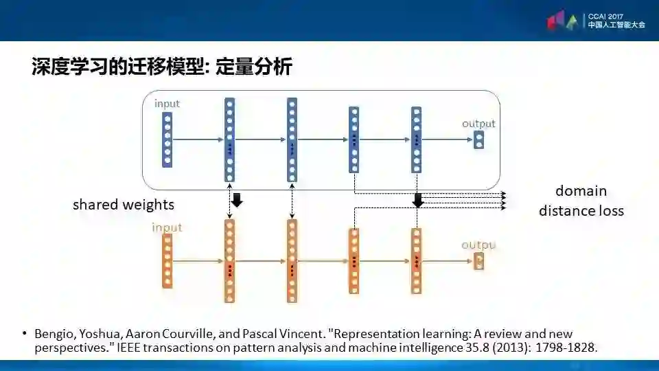 在这个里面我们可以看知识到底有多少可以从蓝色到橘色的,从源领域到目标领域,产生这样的迁移,我们可以看到中间层有很多层参数可以共享。另外层次越高的话,可能它关心的高层的概念离得越远。我们关心的是领域之间的距离,我们能否把领域之间的距离刻画出来,在深度学习的初创期,有很多启发式的做法,其实很多概念是和迁移学习不谋而合的。