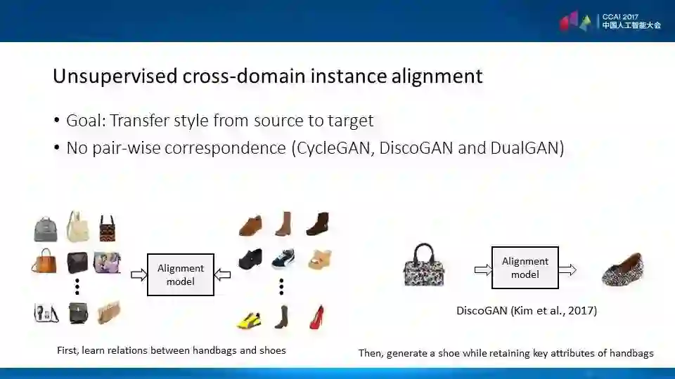 很多学者也用这个方法来做迁移学习,比如说给两个数据集,我们一开始并没有一个数据,并不知道这个包对应这个鞋,系统通过深度网络,可以把这个Alignment模型生成出来,根据这个模型找到一个最匹配的鞋的模型,而且是完全生成的,在原数据,鞋的数据集是没有的,就像右边这里展示的。这种也是迁移学习的概念。