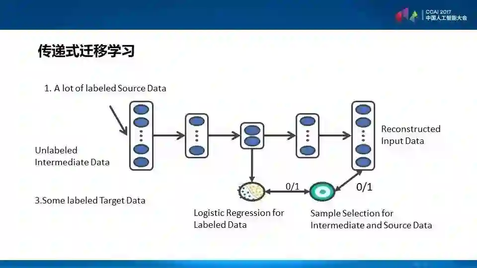 传递式的迁移学习也可以利用深度学习的分层这个概念进行。我们右边这里有三类数据,有一个是源领域的数据,比如图像,有一个是目标领域的数据,比如说文字,中间有很多文字和图像混杂在一起的领域。我们一个做法就是在中间领域挑一些样本,让它更好地帮助源领域迁移到目标领域,这些就像中间石头过河一样的。