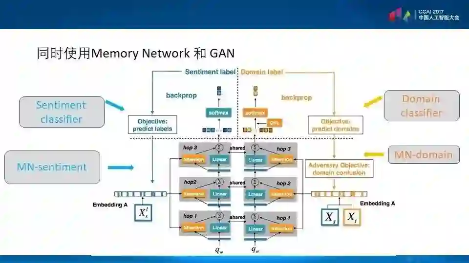 我们通过迁移学习把这个词找出来,在这里用的工具是Adversarial模型,在一堆摹本里面找出关注量比较大的词和词组,有了这一Adversarial模型,我们就可以自动打分,我们打的分数是否靠谱,可以用另外一个Domain Label的词告诉我们,什么样的词才有这样的特性呢?首先两个领域共享,能够帮助我们在新领域共同地指出舆情的趋向。同时希望模型越少越好,就是这三件事翻译成目标函数里面,就能建立模型。左边是舆情的Classifier,右边是领域的,我们同时希望领域的混淆度越大越好,同时我们希望Sentiment(舆情)的准确率越高越好,这两个之间形成博弈,就形成了GAN(生成网络)的概念,另外是多任务学习,就是两个任务共同进行,共同有一些共享。