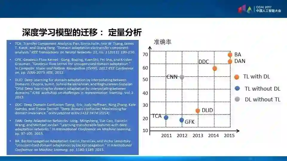 下面我们看看这样一种分层的研究对迁移学习到底产生了什么样的作用呢?我的学生魏颖就把最近的迁移学习和深度学习共同的工作画了表,这里面的名词像CNN、DDC都是最近发表的文章里面的系统名。横轴是年代,从2011年到最近,纵轴是准确率。左边是我一些学生做的工作,把迁移学习在不同领域里面的子空间,它们共享的知识找到,但是没有用到深度学习的概念,大概是2010年、2011年做的工作,叫TCA。
