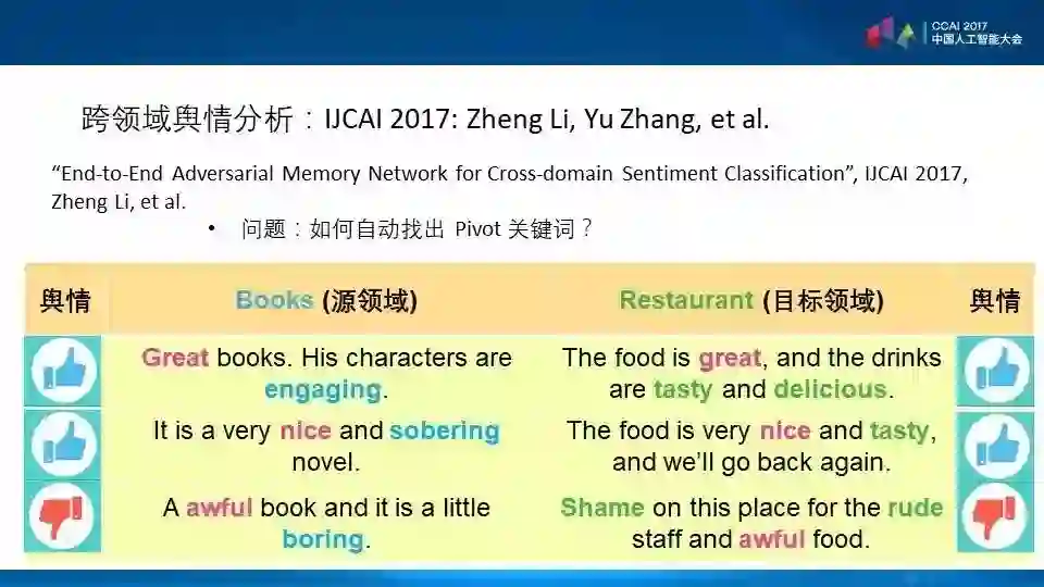另外是我们要去发表的一篇文章,做舆情分析。我们知道舆情分析是非常有用的,不管是在商业上还是在政府的服务上,大家都希望了解那么多的留言,是正向还是负向的?为什么是这样的?对哪些产品有兴趣?大家对哪个服务满意等。我这里给出两个不同的领域,如果我们在一个领域已经有像最左边这里给出的标注,比如说Great,这就是一个赞,说这个是Owful book,就给出一个差。我们的问题是能否借助相同领域的数据来减少我们的分量,使得我们建立一个靠谱的模型,在新的领域、目标领域。这是一个非常好的迁移学习的场景。