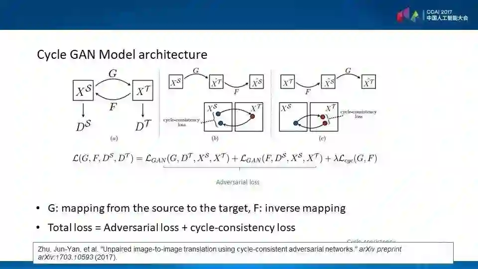 Cycle GAN的思想也非常有趣,一个源领域可以迁移到一个目标领域的话,我们同样也应该让一个目标领域的数据、知识迁移到源领域。如果是回来的话,如果还能返回原来的样本,那么就是说明迁移已经学得靠谱了。就像我们拿一首唐诗到机器翻译的软件翻译成英文,然后再拿同样的软件再翻译回中文,我们大家知道往往得到像乱码一样的东西,完全回不到原来的一首诗,如果能够回到原来的诗,那翻译就靠谱了,概念也是类似的。