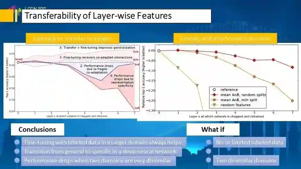 也有人把这个工作系统地进行了比较,我们可以看到代表迁移能力的红色是逐层下降的,从左到右逐层加深,如果是以深度学习的模型,下层在图像上比较容易迁移,在上层就不容易。我们在当中也可以做各种各样的演算和变化,比如说我们可以让迁移过来的参数,让它在之后的领域里面再得到重新的训练,这样就会得到上面的这条线,我们这个线放得越宽迁移能力就会变得越强,如果两个领域之间相差太大了,那么这个迁移是没办法进行的,就像下面的这条蓝线直线下降,这个能力就不行。