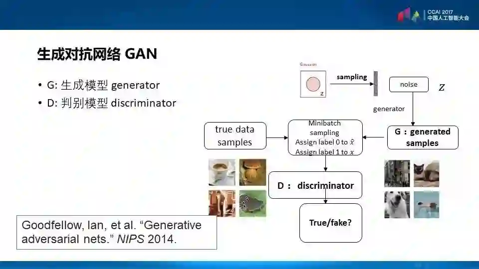 还有一种最近比较火的思想就是叫生成对抗网络GAN,它的思想来自两个模型交互,一个是生成模型,可以生成样板,就是右边的G模块,它一开始是非常粗糙的。还有是D模型,比较生成和真实的样本,它可以告诉你有没有被发现,你生成模型生成的样本够不够好,经过他们两者之间的博弈,最后就产生了学习的跃进,使得G和D两者都得到了改进。