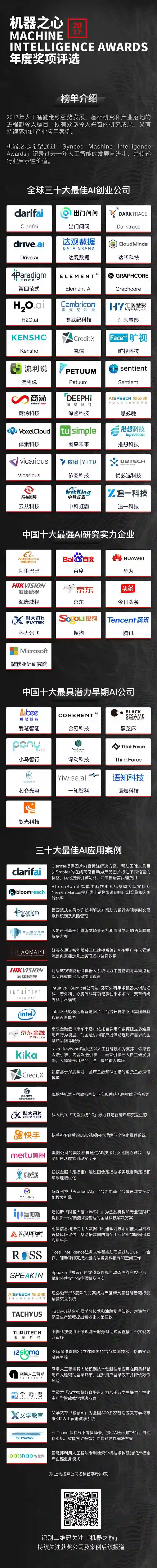 机器之心根据研究实力、技术与产品、市场与行业潜力、运营能力、资本与财务状况、创新性与实用性等多项标准,评选出四项大奖:全球三十大最佳 AI 创业公司、中国十大最强 AI 研究实力企业、中国十大最具潜力早期 AI 公司、三十大最佳 AI 应用案例。具体结果如下: