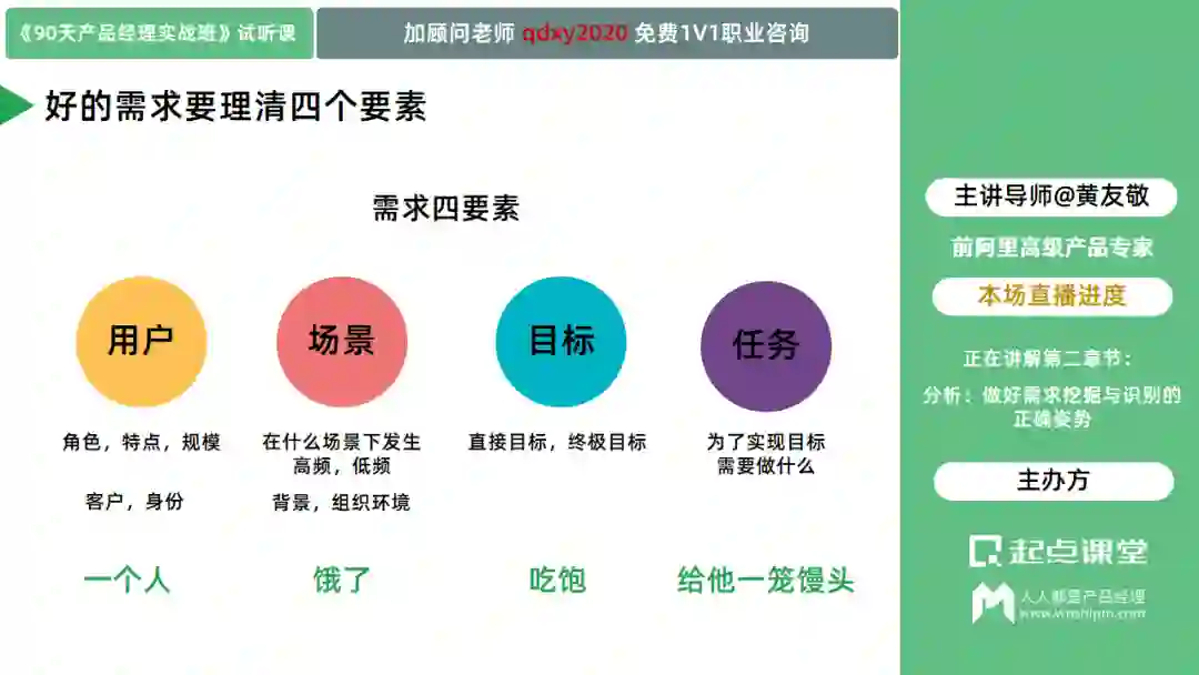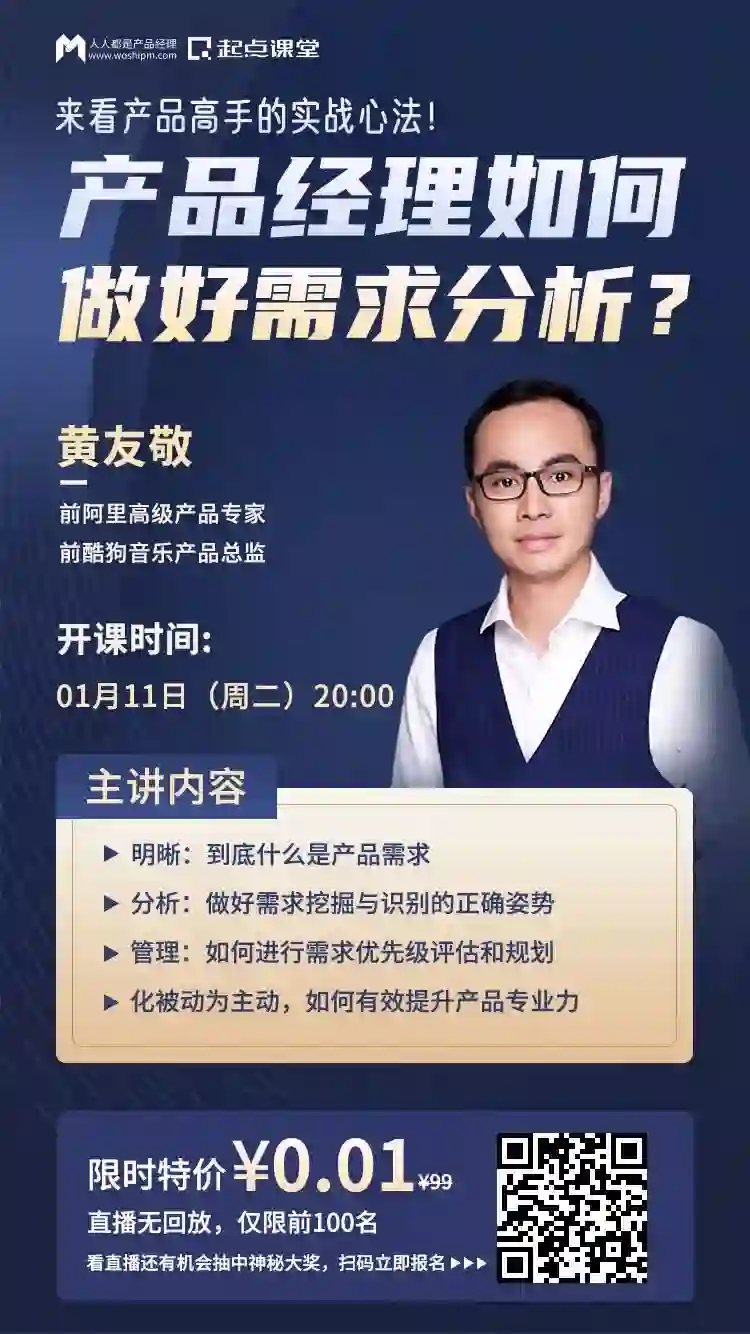 别慌,我特地为你准备了直播福利课,针对产品新人解决在需求分析中存在的信息获取难、功能拆解难以及数据分析难等具体问题,帮助你避开需求分析中的误区,做有价值的需求分析!