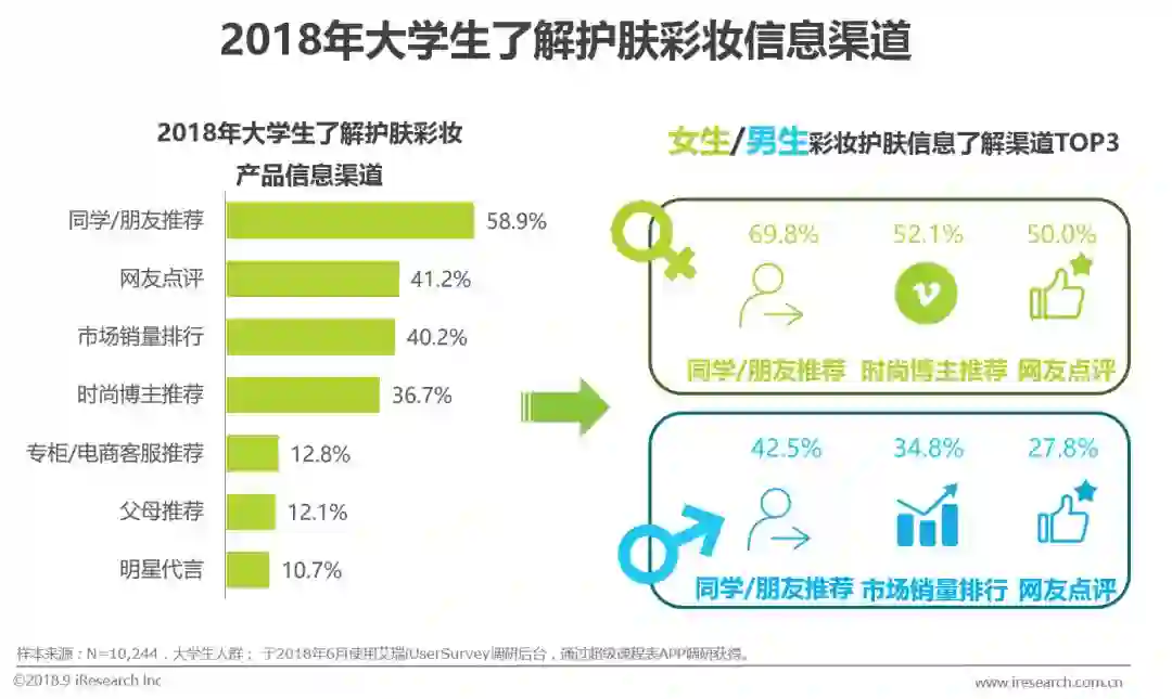 在购买护肤美妆产品前,身边的同学/朋友的推荐是首要的信息来源。其次,女生更容易受时尚博主推荐,而男生更倾向于参考市场销量。