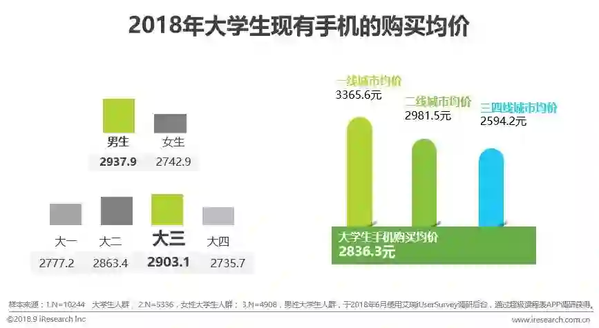 大学生平均每14个月换一次手机,更换频率较高;关注数码产品的硬性配置;大学生使用手机的均价为2836.3元。