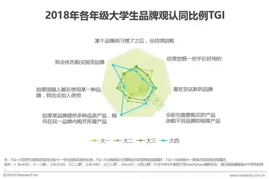 大学生使用的品牌在大学期间迭代升级,大学阶段的品牌观转变较大;大一挖掘品牌,大二大三尝试新品意愿更强,大四独立的品牌观念逐渐形成。