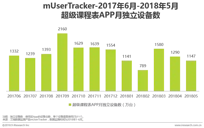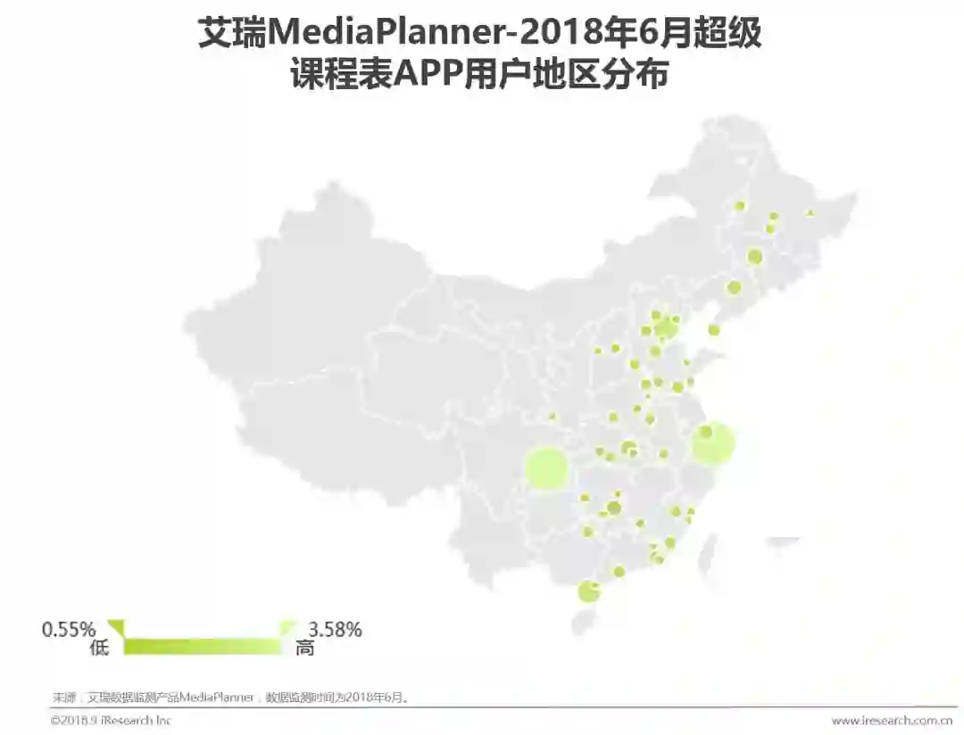 艾瑞监测数显示:2018年1-6月份,超级课程表APP的月度独立设备数达千万级别,广泛分布于全国各个区域,在高等学校较多的区域更为集中。
