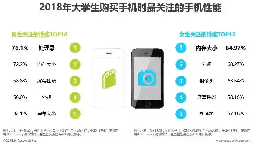 男生最关注的手机处理器的性能,其次是内存大小、屏幕性能等直接影响操作体验的配置。女生最为关注内存大小、外观、摄像头等,女生对手机的拍照功能要求更高,相应的希望有更大的照片储存空间。