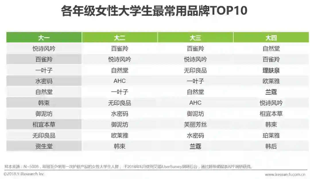 大学生中,尤其是女同学们,对大牌彩妆护肤产品及品牌有较高的认知,也会主动了解相关的推荐,只是碍于经济能力,使用的比例较低。随着对品牌了解的增加,高年级学生开始拔草大牌,大三、大四的女生常用品牌TOP10,开始出现兰蔻等的专柜品牌。