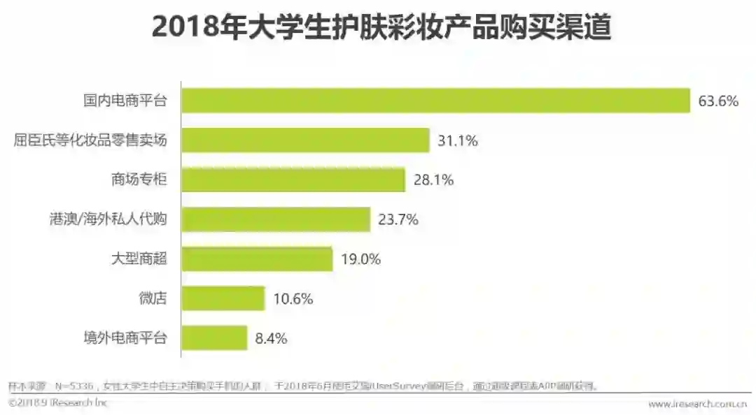 电商平台是大学生首要的购买渠道,23.9%的大学生目前的手机通过京东购入,63.6%的大学生会选择通过国内的电商平台来购买彩妆护肤产品。线下渠道的仍然非常重要,线下卖场、专卖店等占据了很大的比例。