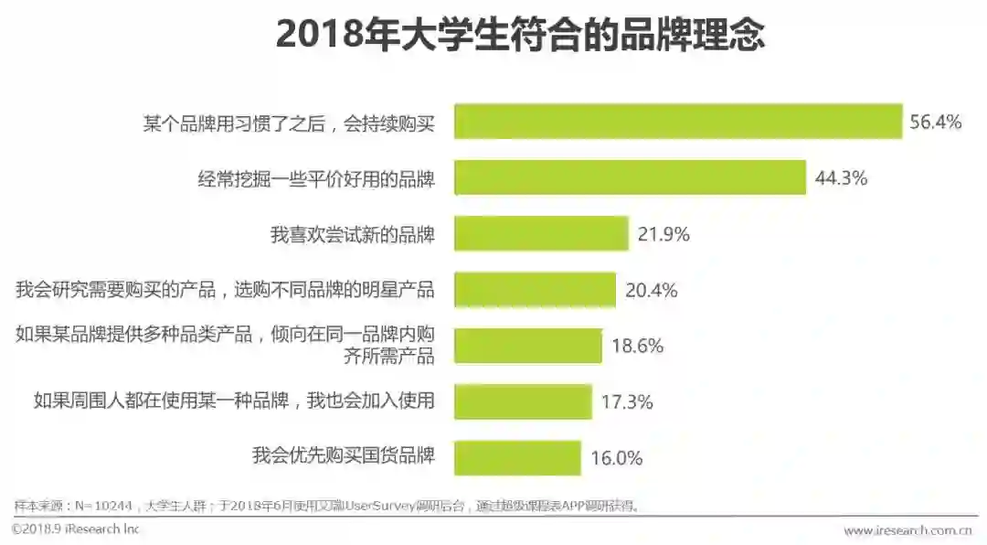 大学生持续回购某个品牌的比例为56.4%,主动挖掘平价好用的品牌比例为44.3%,品牌尝新意愿高。