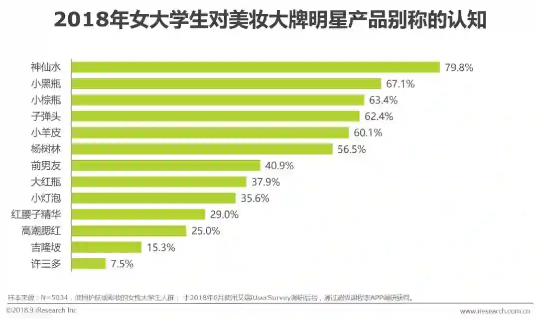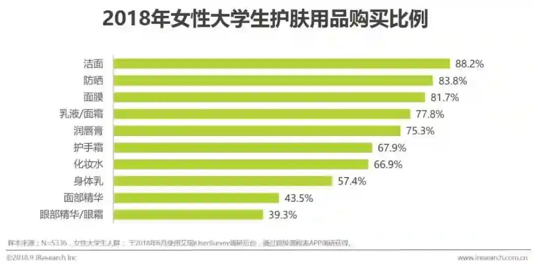 只有1.1%的2018年在校女大学生不曾用过洁面护肤产品。另外,女性大学生在洁面、防晒、面膜、面霜、润唇膏的购买比例相当,大部分女生开始使用全系列的基础护肤产品。受护肤需求以及经济能力等因素约束,面部精华、眼部精华/眼霜等精细化护肤产品在整体女大学生中的购买比例较低。