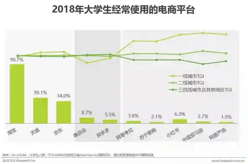90.7%的大学生经常使用淘宝,其次为天猫和京东,二三线城市使用唯品会和拼多多的比例高于一线城市,一线城市使用网易考拉、苏宁易购、小红书、中国亚马逊和网易严选的比例明显高于二线和三四线城市。