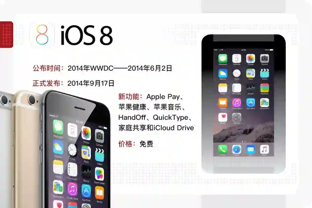 和iPhone 6系列一起发布的iOS 8没有7那么激进,更多地是在7的基础上完善,在这一代系统当中,苹果终于开始接纳第三方应用了。