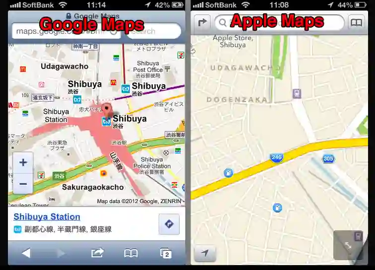PS:苹果地图初期在亚洲的体验真可谓一言难尽,不信的同学可以看看下面这张日本涩谷地图的对比,左边是谷歌地图,右边是苹果地图。