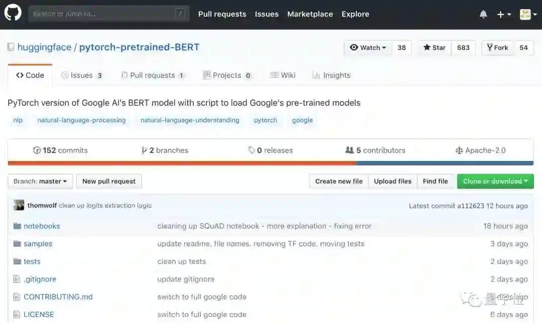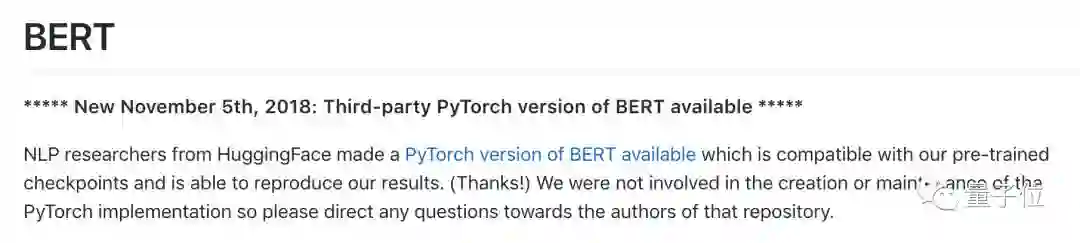 不要担心,就在这两天,一个名叫“抱抱脸(HuggingFace🤗)”的团队在PyTorch上实现了BERT,开源不久,Google在官方BERT实现的说明开头热情推荐,已经在GitHub上攒了将近700星。