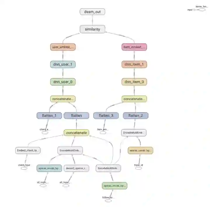 关于DSSM模型原理及实现,网上已经有很多质量不错的参考文章了,比如王多鱼的实践DSSM召回(如果对dssm模型原理不熟,建议先阅读这篇文章,再看本文实践部分,本文主要讲实现),总结的非常不错,王多鱼这篇文章DSSM实践是基于浅梦大佬开源deepmatch包实现的,但是在推荐系统实践中如果直接调用别人的模型包会遇到诸多不便,需要在自己业务场景中做finetune;实际生产中,模型所用到的特征往往都是稀疏的,多值变长的,对有些特征我们还想让它们共享embedding,说到这里,我要非常感谢石塔西的这篇文章用TensorFlow实现支持多值、稀疏、共享权重的DeepFM,从这篇文章中,我得到很多启发;本文下面介绍的主要是自己从各位大佬那学习到的知识总结,并无什么创新点,希望对一些刚入坑的童鞋们有所帮助。好了,那我们开始,Talk is cheap, Show me the code.