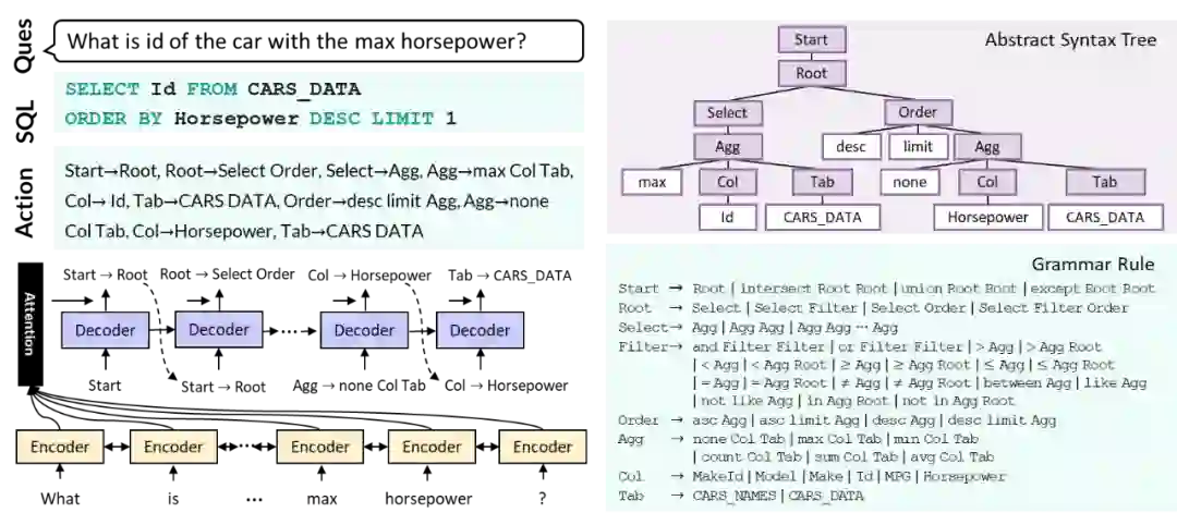 该动作序列可以通过从左至右深度遍历 SQL 语句 SELECT Id From CARS_DATA ORDER BY Horsepower DESC LIMIT 1 的抽象语法树(abstract syntax tree)得到,如图中的紫色部分所示。与普通的序列到序列模型将 SQL 语句单纯视为词序列不同,基于语法的语义解析器将 SQL 语句视作动作序列。通过融入 SQL 语法的知识,其生成的任意动作序列都可以转换成一个语法正确的 SQL 语句。