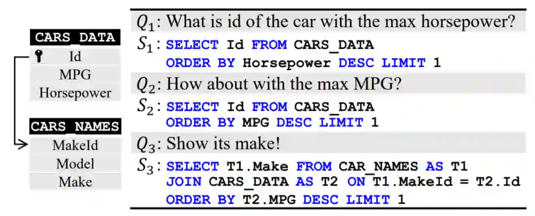 图1:对话式语义解析示例,左侧是数据库的 schema,右侧是用户与系统的对话