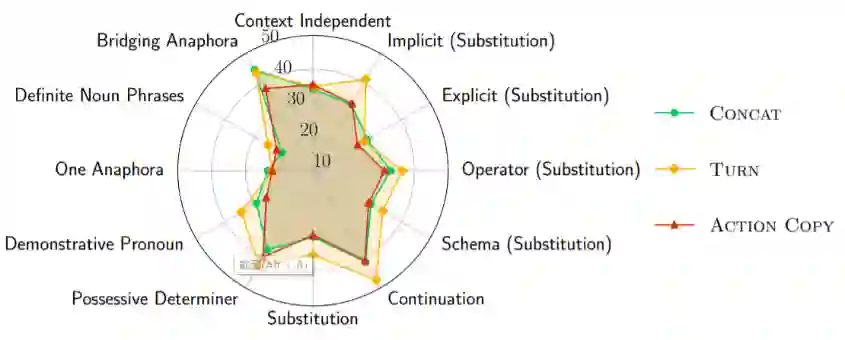 目前已有许多建模上下文的方法,但学术界对于“哪个上下文建模方法最有效”这个问题尚无定论。许多研究问题也都值得探索,比如“这些方法擅长解决什么类型的上下文现象”,“它们目前还无法解决什么类型的上下文现象”等等。受此启发,我们试图通过一项细粒度的探索性研究来回答这些问题。相信如果这些问题可以得到解答,那么对话式语义解析领域未来的发展脉络会变得更清晰。