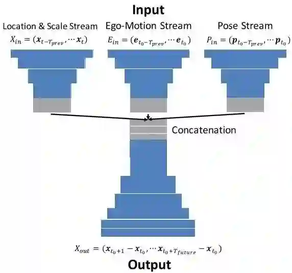 所以问题可以表示为,已知t时刻及前 Tp 帧的四种 feature 序列,要求预测后 Tf 帧的行人检测框位置序列。本文提出了一个很简单的基于 1 维卷积的网络,如下图所示: