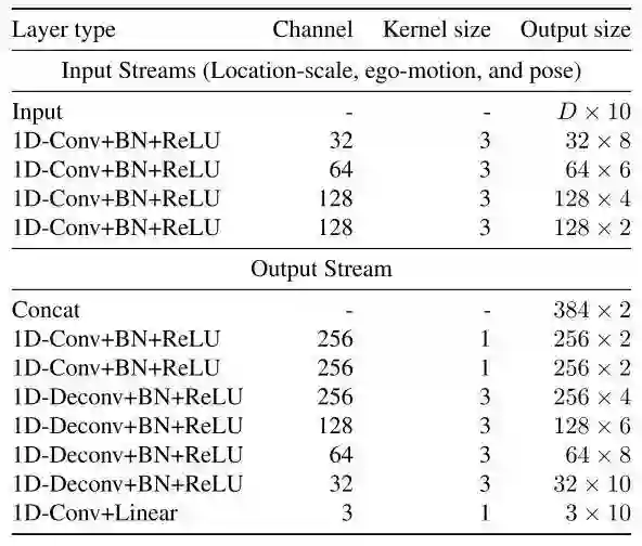 网络的具体配置如下表所示,基本上就是 1D-Conv+BN+ReLU 的堆叠。最终的输出即为所需要的未来检测框位置序列。