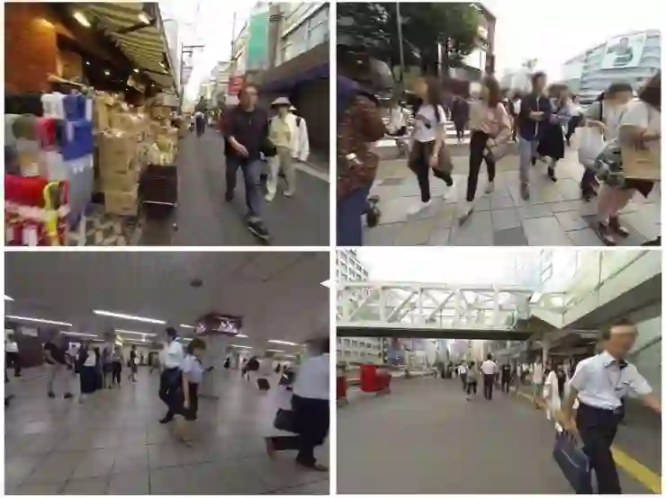 针对第一人称视频的行人轨迹预测这个问题,由于没有现成的数据库,所以作者自己采集了一个新的数据库,称作 First-person locomotion (FPL) dataset。这个数据集是在东京的街头采集的,下图是数据集中的一些示例图像。