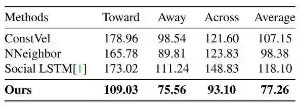 测评方式方面,本文采用了与[6]中相似的方式,使用 Final Displacement Error (FDE) 作为测评指标。FDE指标即最终预测轨迹和最终实际轨迹之间的L2距离。为了更加精细的评估,该数据集还把行人轨迹分为了1) toward 2) away 3)across三个子集,分别计算了 FDE 以及 3 个子集的平均 FDE。
