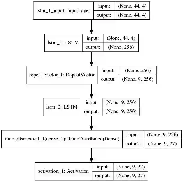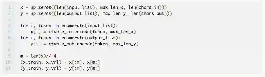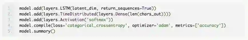 这就得到了简单的编码器模型。我们将构建一个类似的层作为解码器。但上面的代码片段的输出是个 2D 数组。我们通过使用方便的 RepeatVector 层重复输出时间数量 max_len_y,将其转换为 3D 张量,并作为下一个 LSTM 层(解码器)。现在,我们在这个 LSTM 中使用 return_sequences = True 选项来输出隐藏状态序列,我们需要使用这些信息进行预测。为此,我们使用一个 TimeDistibuted 密集层,它输出一个长度为 max_len_y 的矢量,我们使用 softmax 激活函数来选择最有可能的字母。为了快速了解 TimeDistributed 层的目的,请参阅 Jason Brownlee 撰写的博文:How to Use the TimeDistributed Layer for Long Short-Term Memory Networks in Python。