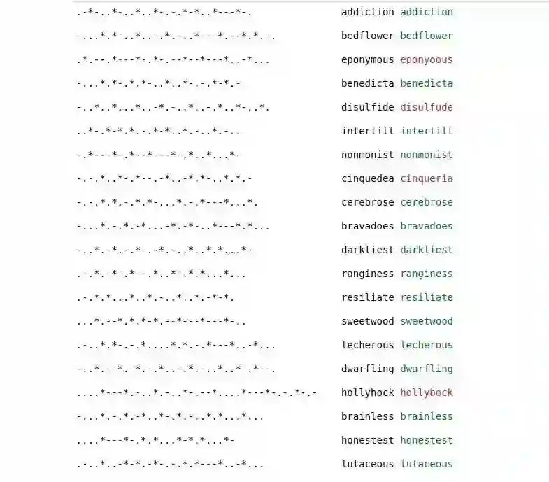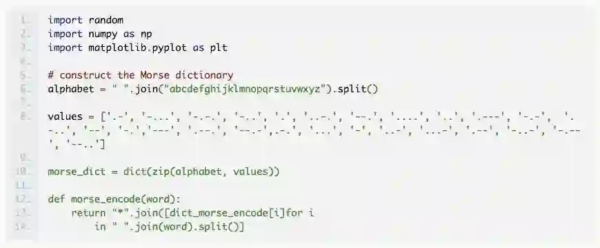 我们开始数据准备工作,构建一个函数,将所输入的英文单词编码为它的 Morse 电码并输出。