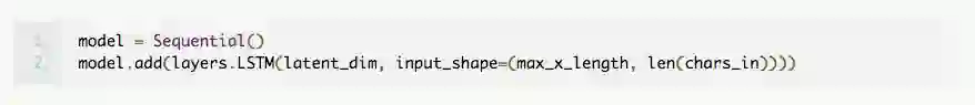 该模型使用 Sequential() 构建,并且每次只添加一个层。第一个 LSTM 层将 3D 张量作为输入,并要求用户指定输入维度。这可以用代码中指定的 input_shape 简单地完成,其中第一个组件表示时间步骤的数量,第二个组件表示特征的数量。对我们来说,特征的数量就是输入序列的词汇表中元素的数量,也就是 4,因为我们有“.”、“-”、“*”和空白字符“”。由于我们每次只提供一个独热编码矢量,因此时间步骤的数量就是 max_len_x。我们还将指定层中的内存单元(或块)的数量(此处用 latent_dim 参数表示,我们使用 256),这是潜在表示的维度。请注意,我们希望将 LSTM 的最终隐藏状态作为潜在表示返回,这包含了来自所有时间步骤的信息,即全部输入序列。如果我们使用 return_sequences = true 选项,那么将得到每个时间步骤的隐藏状态的输出,但这只包含到该步骤的序列信息。