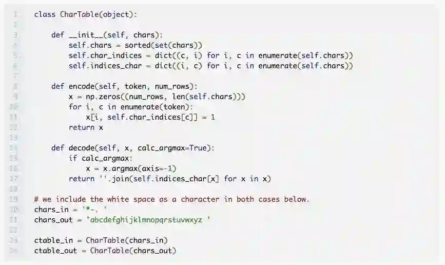 现在,我们构建输入中字符的一个独热编码矢量,使输入数据适合神经网络。为此,我们构建了一个类对象(类似于 Keras 文档中的例子),它将有助于编码和解码,并将 Morse 电码和英语单词解码。我们将类分配给具有适当字符集的对象。