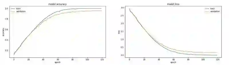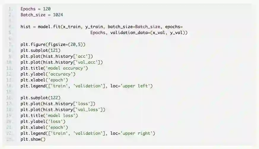 我们将模型拟合到数据中,在集合 x_train、y_train 上进行训练,并使用 x_val 和 y_val 来查看我们的工作情况。需要设置的最后一组参数是轮数(epochs)的数量和批大小。批大小是在梯度下降算法中通过网络传递的训练集的大小,然后对网络中的权重进行更新。通常批大小就是计算机内存可处理的最大值。一个轮数是通过这些批次的训练数据的全面训练一次。此处,我们设置了 1024 的批大小,使用了 120 个轮数,在下图即可看到,在大约 100 个轮数之后,精度并没有明显的增加。一般来说,看哪个参数起作用需要反复试验才知道。现在我们用 fit() 方法来拟合模型。