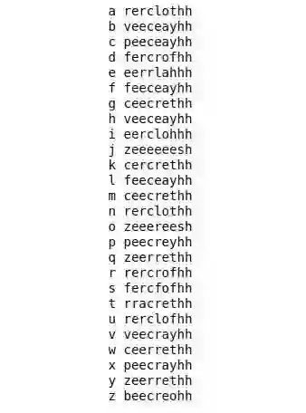 正如你所看到的,错误的预测也不算太坏。我们必须提醒自己,破译密码并没有破解代码,也就是说,弄清楚每个字母代表什么。事实上,我们可以输入字母的代码,并查看网络预测的单个字母的代码,如下所示,我们离目标还很远!