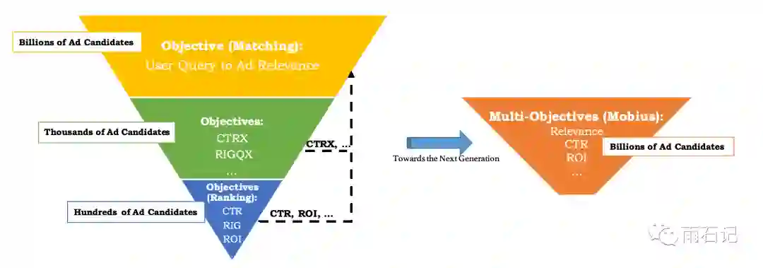 这个架构从速度的角度考虑运行的完全没有问题,但是从目标的角度考虑,就有问题了,问题在于最前面的Matching算法跟最后的Ranking算法的目标不一致,这就会导致在最后排序的时候,可能最相关的广告并不在候选集合中,即便排的再好也无济于事。