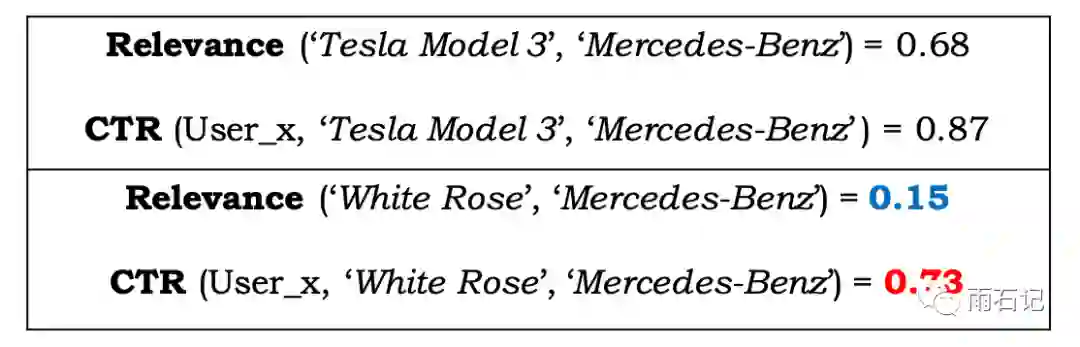 Tesla Model 3和Mercedes-Benz都是出现比较频繁的数据,White Rose 则不是。这里Tesla Model 3和Mercedes-Benz能够给出正确的相关度和CTR估计。但是对于White Rose而言,相关度确实很低,但是CTR评分却很高,导致了不正确的广告出现了。