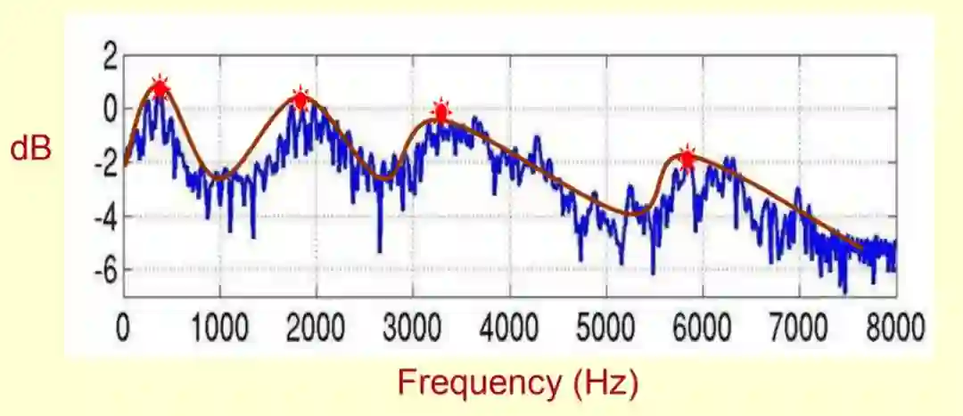频谱包络实际上是在一个频率-振幅图中,将每个频率共振峰用平滑的曲线连接起来,而这个平滑的曲线就是语音的频谱包络,下图展示了频谱包络在频谱图中的位置。