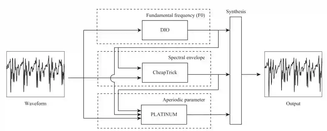 WORLD语音合成系统可以根据F0、spectral envelope、aperiodic三个参数来合成一段语音,因此,在前沿的语音合成研究中,会通过深度学习技术学习到一段文本所对应的这三个特征,然后借助WORLD合成为语音。