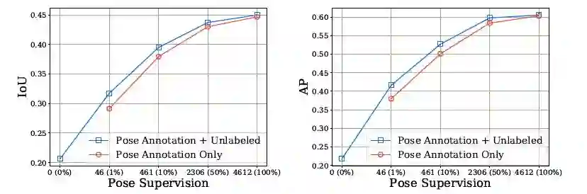 2、本文发现基于类别的监督是不必要的,但是基于姿态的监督十分必要。研究表明,在拥有足够多的姿态注释时,没必要加入无标签图像训练;但在有限姿态监督或只有极少量的实例标注情况下,加入无标签图像训练将会使模型性能有很好的提升。