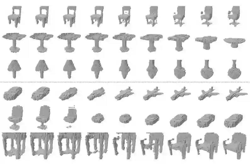 使用了来自ShapeNetCore数据集的体素化的32x32x32三维形状。其中选取了十类物体:飞机,汽车,椅子,陈列柜,电话,扬声器,桌子,长椅,船舶和橱柜。对于每一类,都是用ShapeNet的默认分割进行训练,验证和测试。