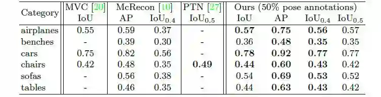 在该过程中,我们对每一类物体训练了一个单独的模型。我们对0到100%的姿态监督都进行了实验。我们将模型与现有的单目三维重建模型进行性能比较,结果如表1所示。