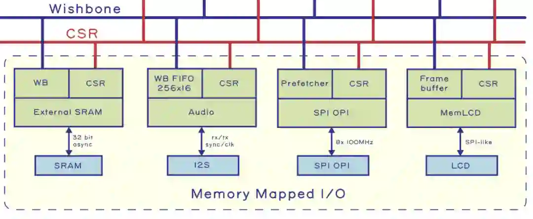 “MemLCD”是LCD的帧缓冲。Sharp Memory LCD包含自己的内部内存,因此即使宿主断电,也能够维持图像。因此,MemLCD帧缓冲就是LCD自身的缓冲。它负责管理LCD中的哪些线需要重画,在CSR上有请求发生时,它只会刷新那些需要重画的线。这样可以提高LCD的感知刷新率。如果重画整个屏幕,那么刷新率只有10Hz;但屏幕上的静态内容越多,刷新率也就越高。
