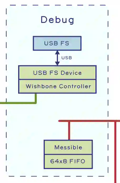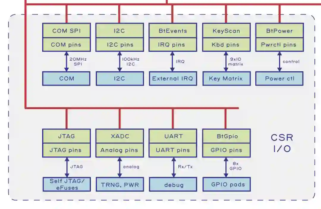 “KeyScan”是键盘控制器。它负责扫描9x10的键盘矩阵来发现击键,使用一个慢速的32kHz外部时钟源。将键盘扫描器与系统核心时钟解耦合,系统就可以在等待键盘输入时进入更低功耗状态,从而将Precursor在两次充电之间的使用时间延长数天。